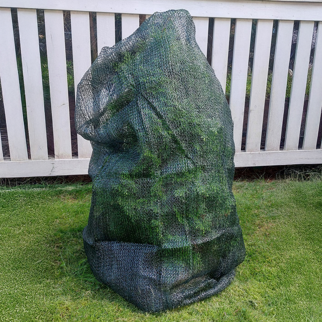 Strömsö-varjostussäkki tarjoaa suojan erityisesti kevättalven ja varhaiskevään haasteisiin, kuten roudan aiheuttamaan kuivumiseen. Vihreä väri sulautuu puutarhaan.